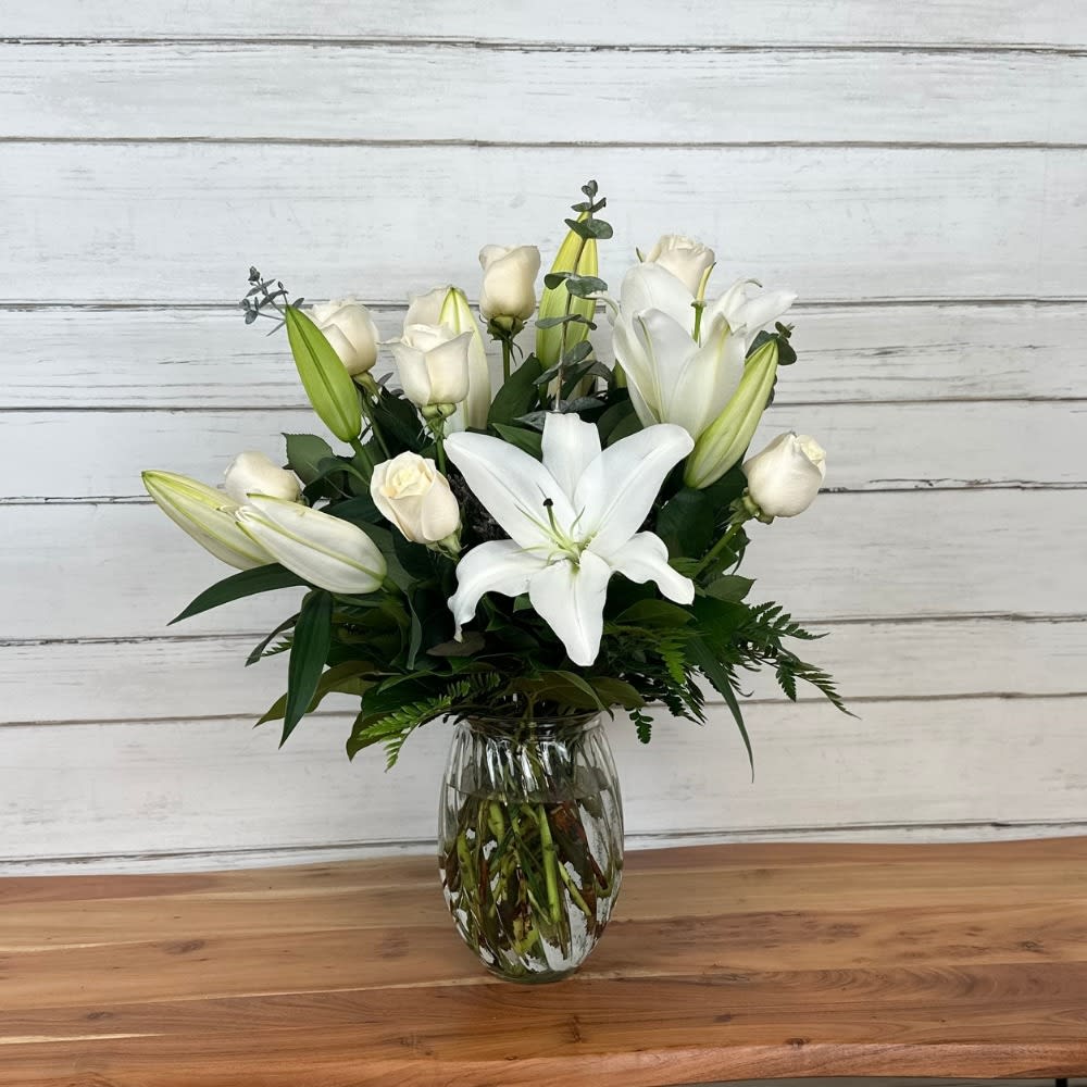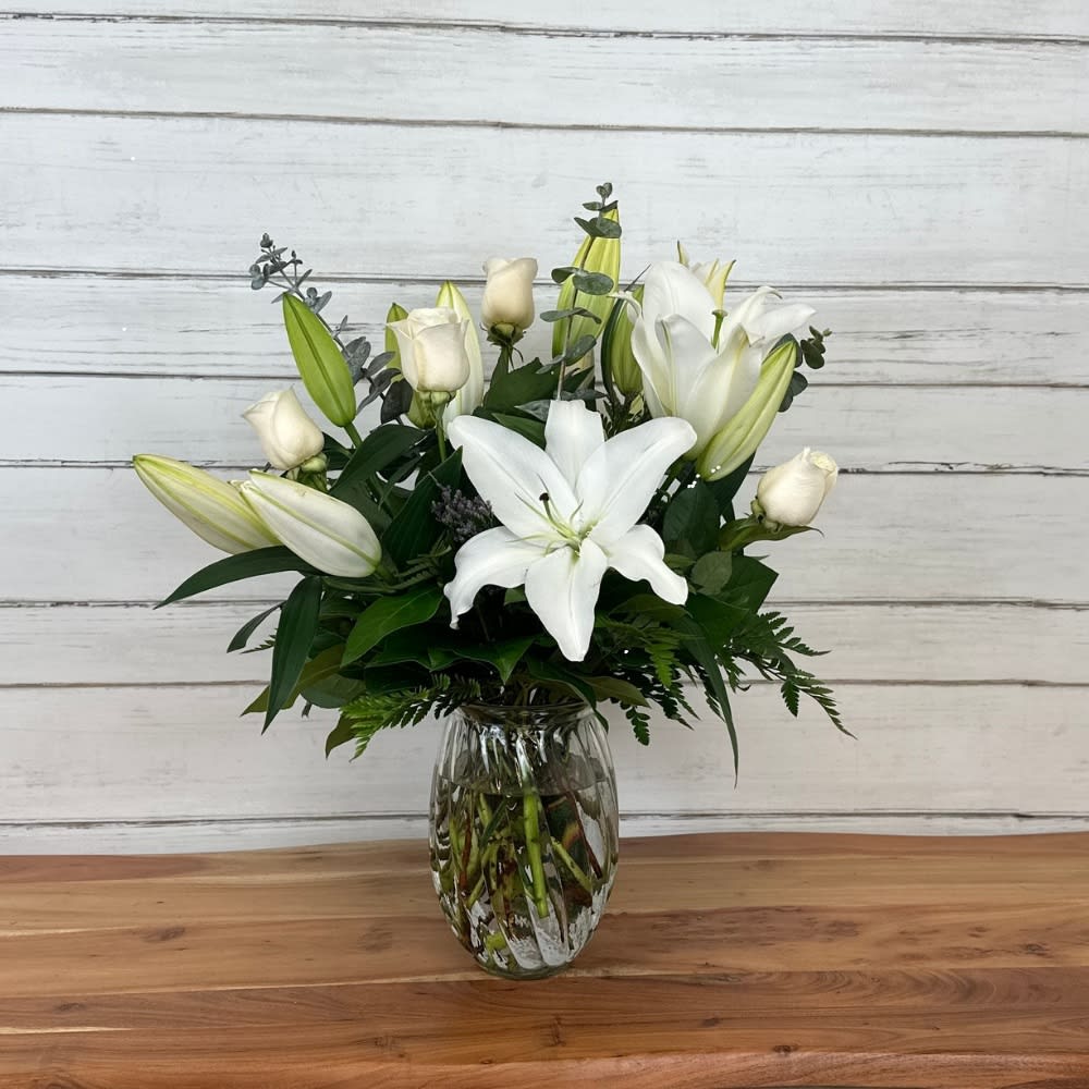 Forest of Flowers’ talented designers expertly arrange this breath-taking classic to emphasize the splendour of crisp white Oriental lilies and delicate purple limonium set against rich greens. Presen...