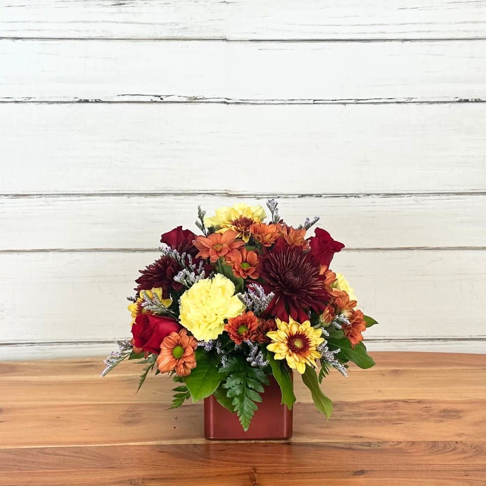 This compact arrangement exudes the warmth and charm of autumn days. Expertly designed by your local florist, it features cremones, carnations, and daisies in rich fall tones, beautifully gathered in ...