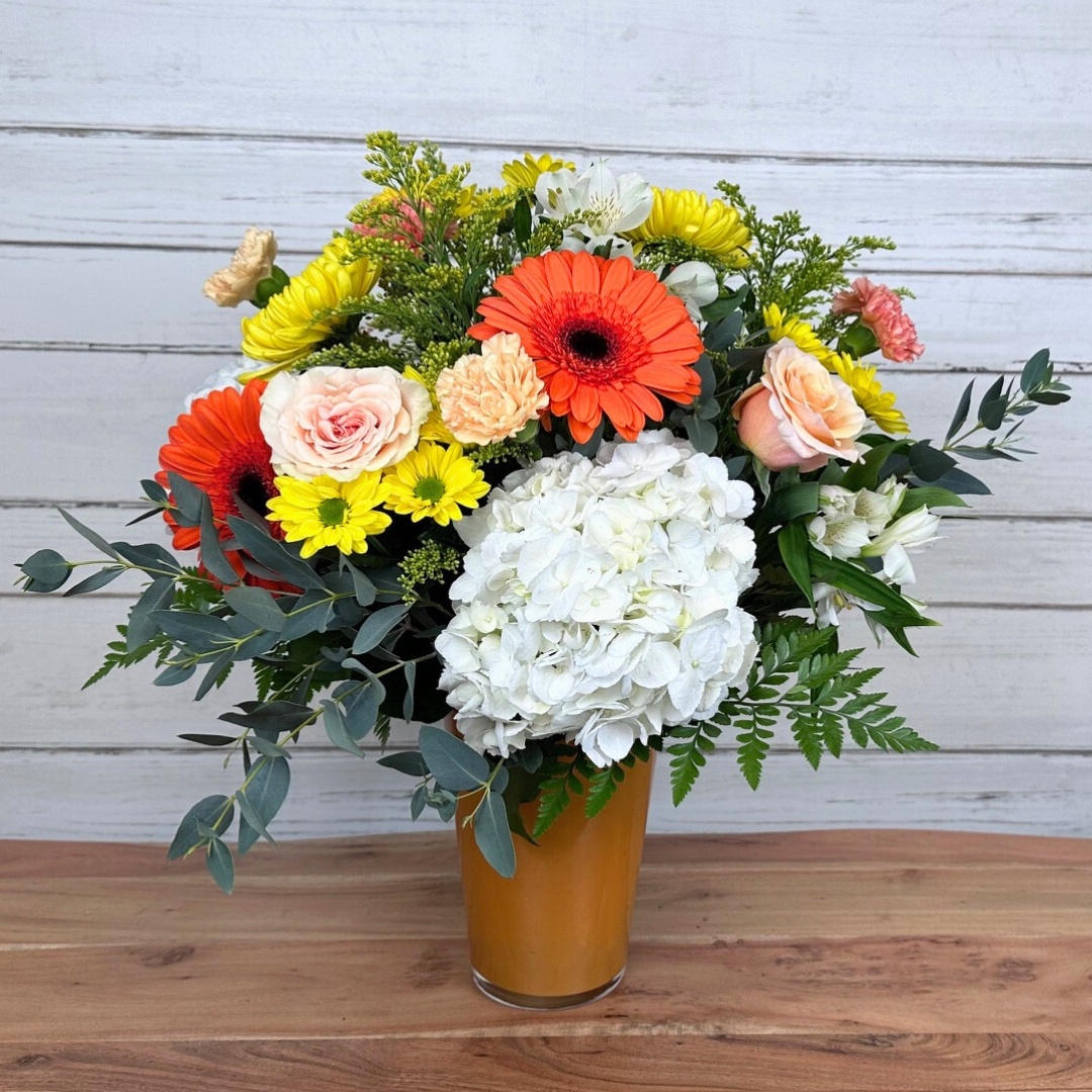 This is sure to become a quick favourite. Designed in shades of orange, peach, yellow and white this classic large vase arrangement features gerbera daisies, roses, hydrangea, carnations and more. It ...
