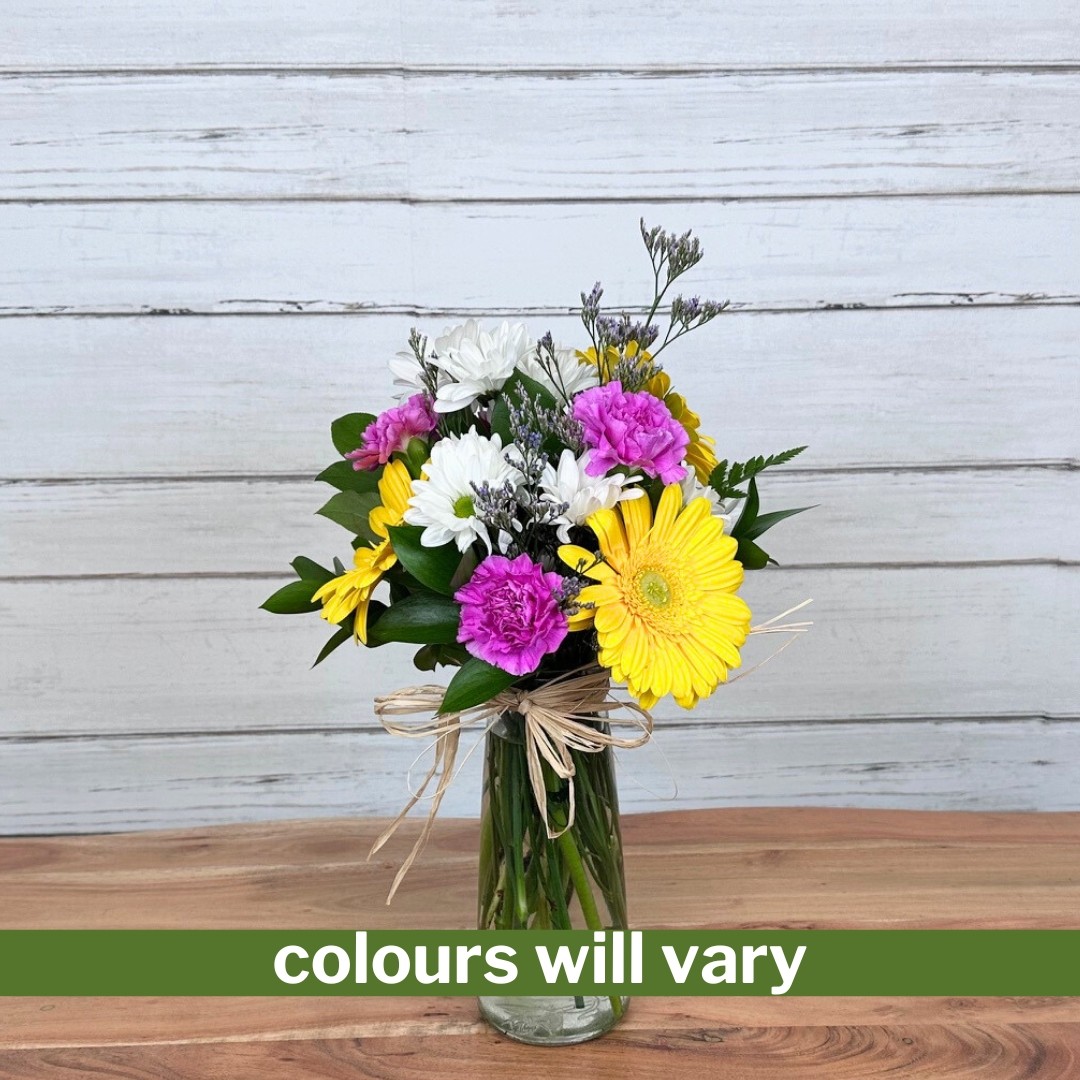 Designed in a small vase with gerberas, carnations and daisies this arrangement pops with colour and is just right for your fun MOM! This arrangement is designed in a variety of colours that are sure ...