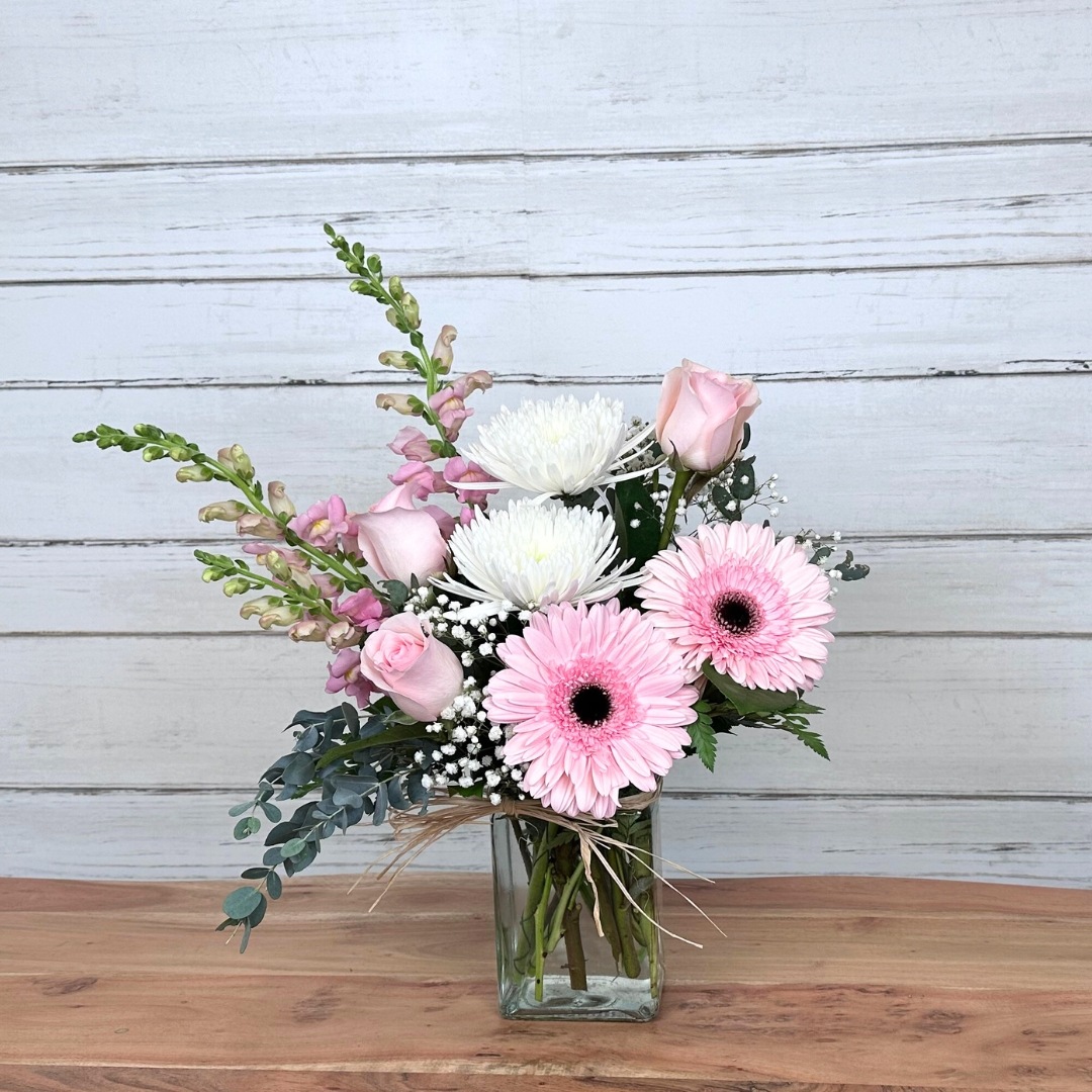 Add a little pink to Mom’s day with this charming one-sided arrangement, perfectly designed in a sleek rectangular vase. Soft, sweet, and just the right amount of “girly,” it’s a lovely way to say I l...