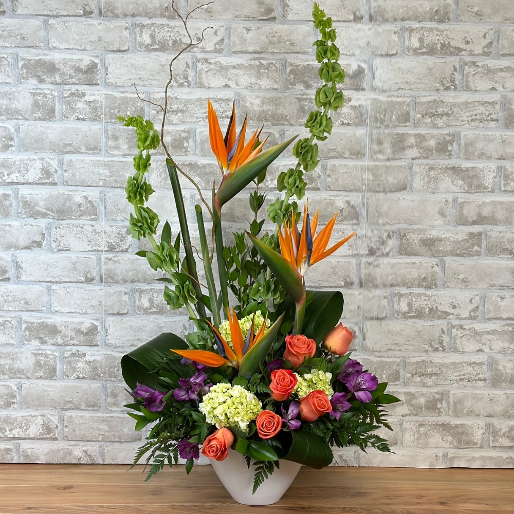 This beautiful tropical arrangement is a lovely way to express your condolences. Designed with Birds of Paradise, roses, and purple alstroemeria this offers a lovely send off to a life well lived....