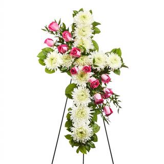 A fitting farewell to a life lived full of faith. This beautiful sympathy cross features white disbuds accented with a spray of pink roses. Pictured easel is included. Upgrade to the Deluxe or Prem...