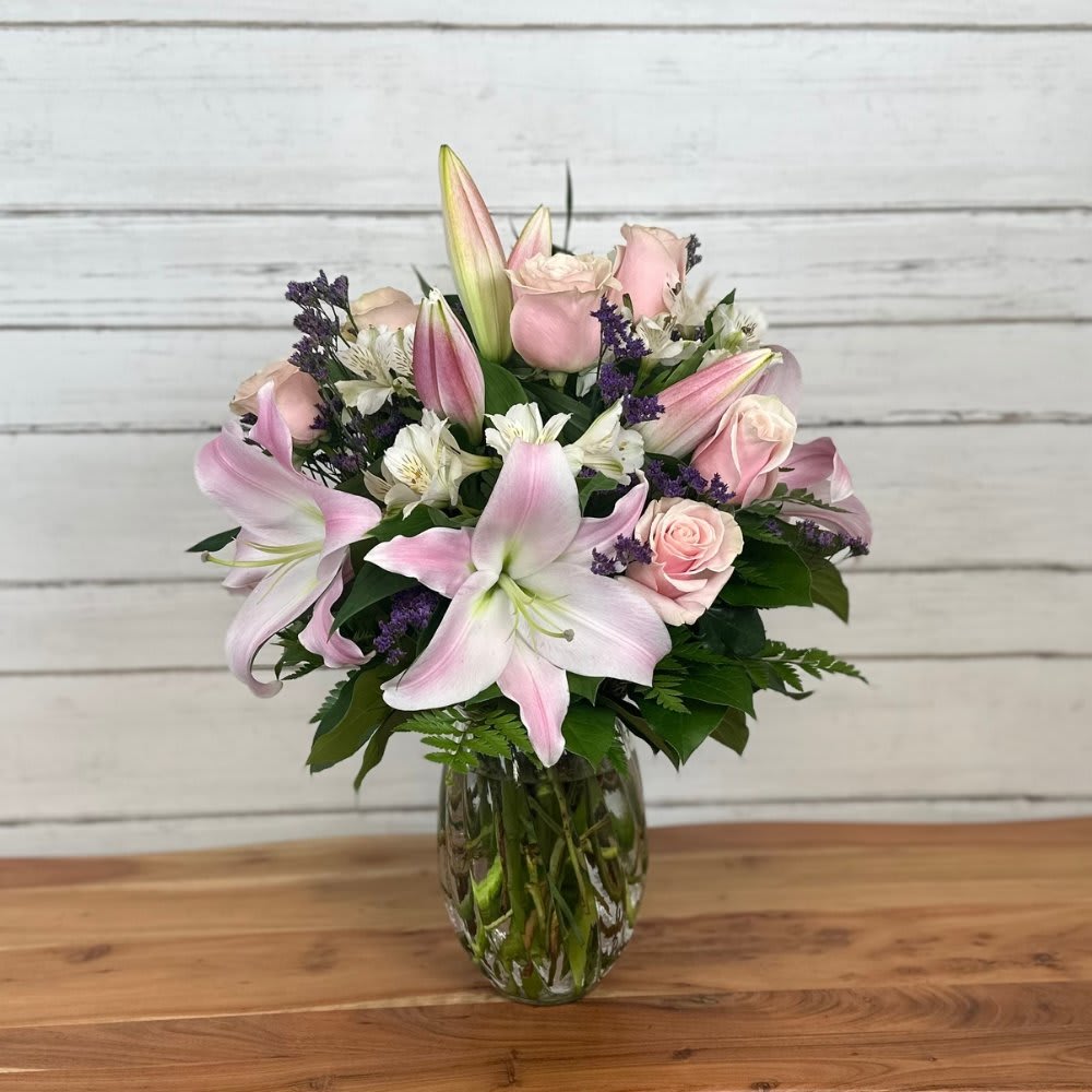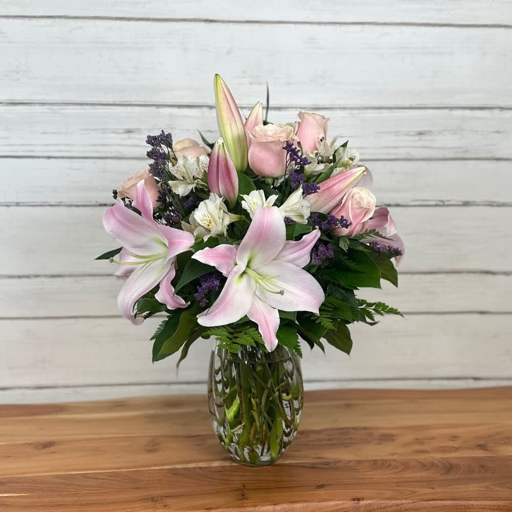 Lovely Lilies and Roses in shades of pink and cream combine in this marvelous display of affection. Whether an anniversary, birthday or just to spread joy, this arrangement is perfect to surprise and ...