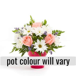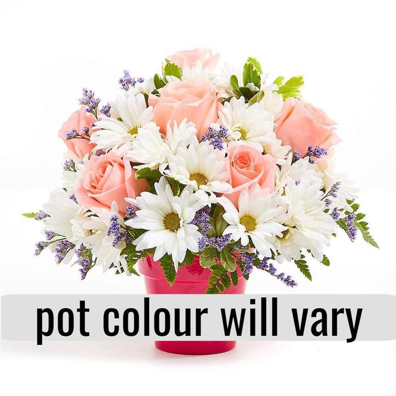 Pink roses and white daisies dance together in a chic pink ceramic pot. This is the perfect pick me up or "Thinking of You" token of appreciation. Approximately: 10" x 10"...