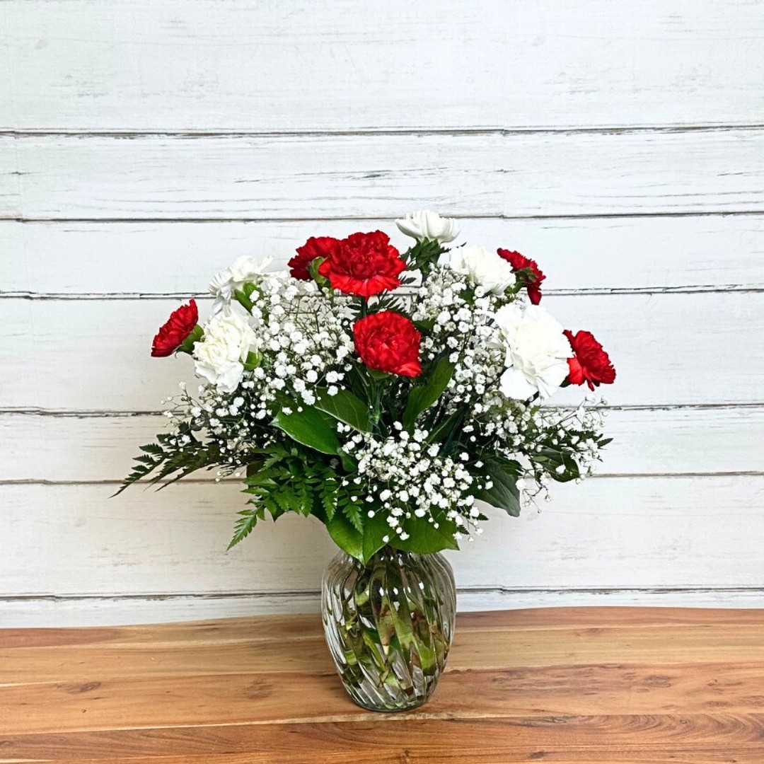Make their day unforgettable with this beautiful expression of love and affection. Featuring 12 long lasting red and white carnations, expertly arranged in a glass vase with delicate accents of babi...