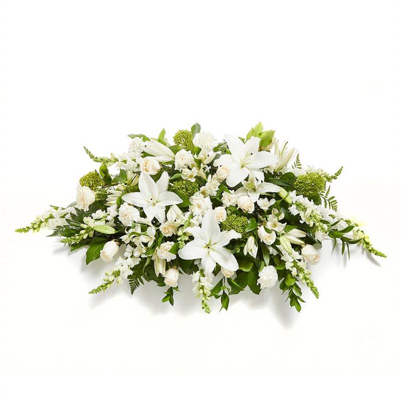 The Enduring Light Casket spray is an exquisite and elegant casket spray of white flowers including ilies, roses, carnations, snapdragons and more to beautifully express your love and everlasting affe...