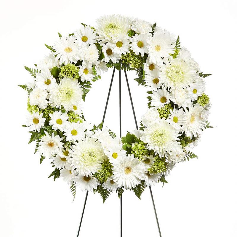 Express your heartfelt condolences with this timeless white floral wreath, designed to convey serene sentiments during a funeral or service. Handcrafted by a talented florist, this elegant arrangement...