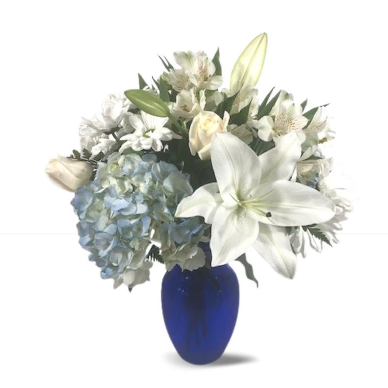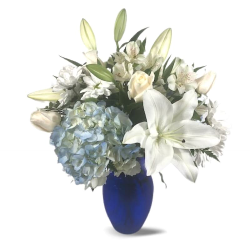 Beautiful shades of blue hydrangea are set off by white lilies, roses and more. This peaceful and calming flower arrangement add a touch of elegance to any room or decor and is perfect for Birthday, ...