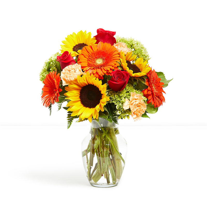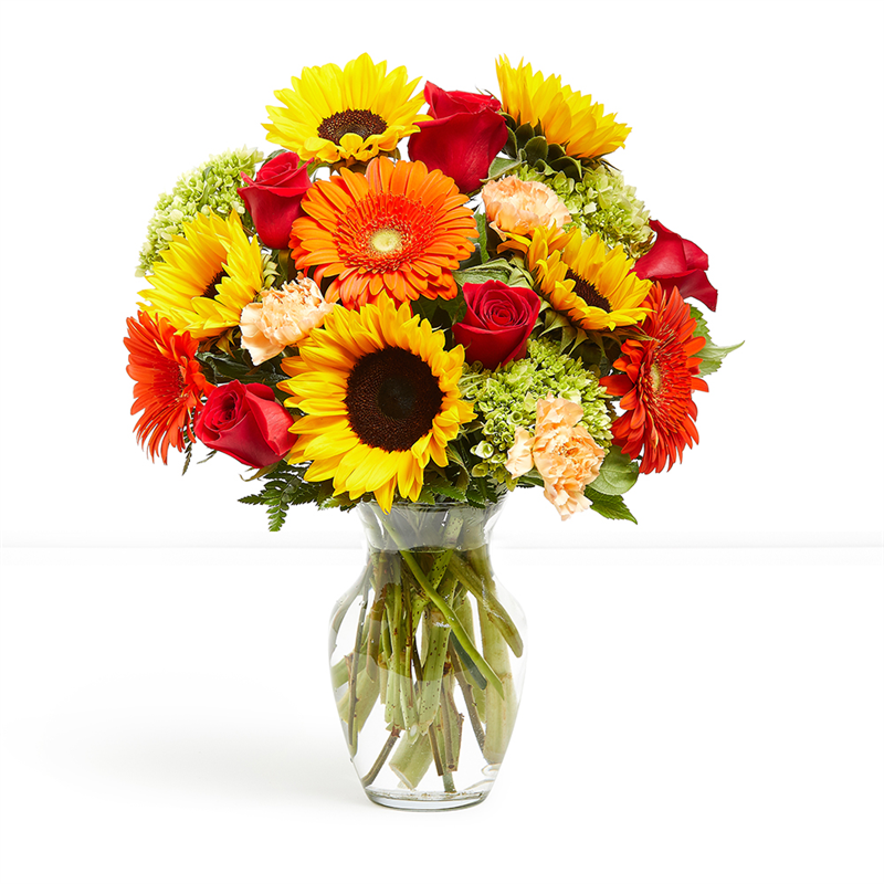 Sunflowers, gerbera daisies and green hydrangea combine to show off the season's gifts. Upgrade to the deluxe or premium version to include premium red roses which are sure to spread sunshine and joy....