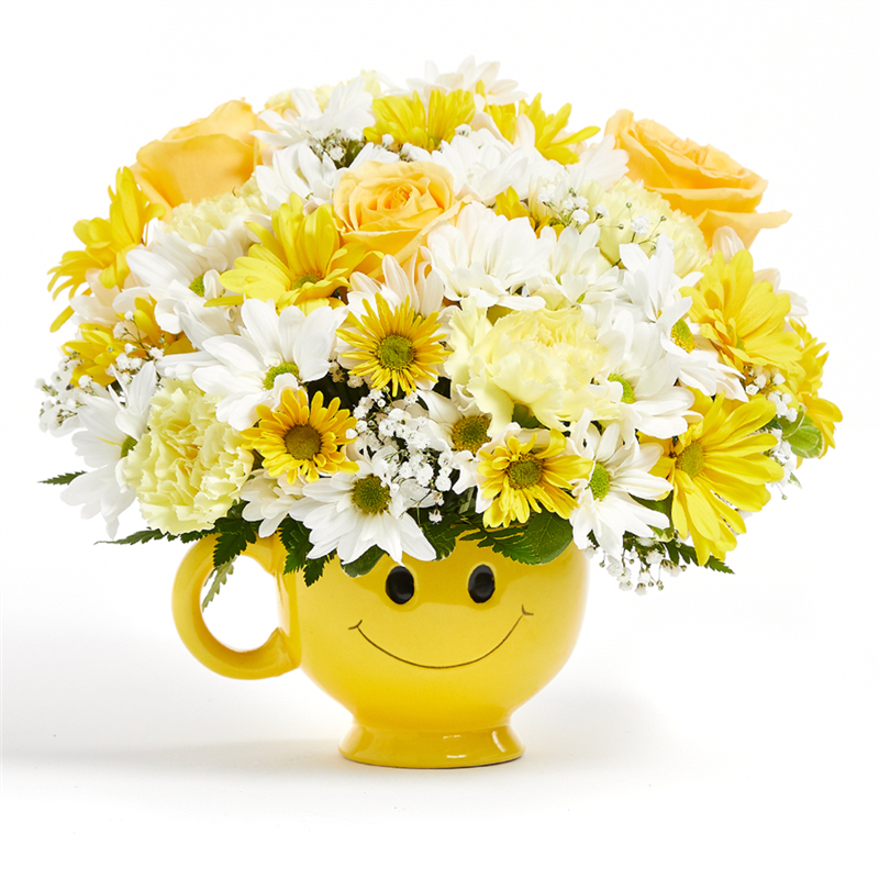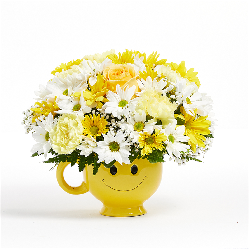 What could be more joyful than a cupful of yellow and white daisies and carnations, all nestled in a ceramic smiley face mug? It’s the perfect pick-me-up for someone feeling down—or simply to bring a ...