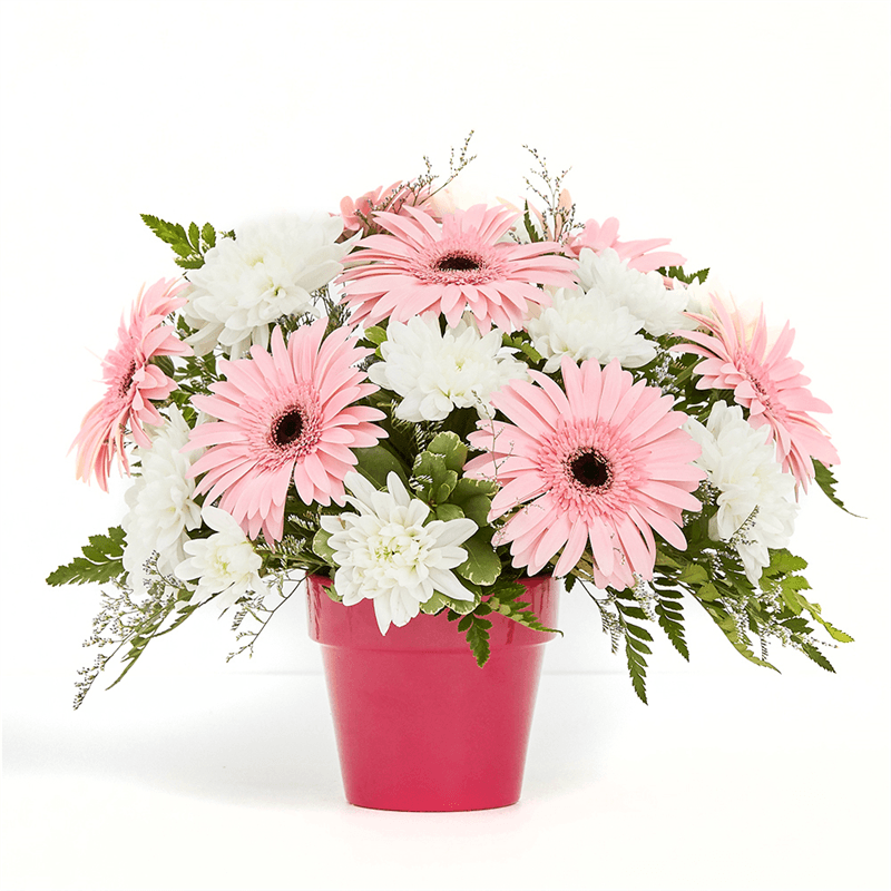 This charming compact arrangement combines vibrant Gerbera Daisies with purple accent flowers to deliver the perfect note of cheer! Nestled in a cute pink ceramic pot, it’s simply delightful and sure to brighten anyone’s day. For an extra touch of beauty, upgrade to the Deluxe or Premium version to add more Gerberas and classic white chrysanthemums for a truly stunning bouquet! Approximately: 10" x 10"